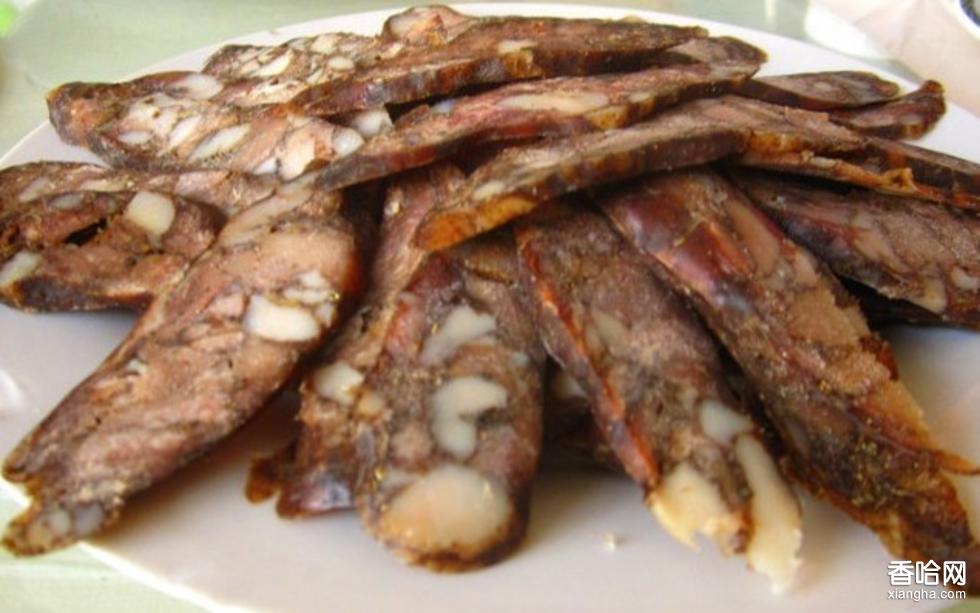 系以新鮮豬大腿肉、肋肉、臀部肉、腰肉為主料,大多為瘦肉;腸衣為漂洗潔凈無暇的豬腸衣;輔料有石落子、砂仁、香精、精鹽、砂糖、純高梁酒及陳年醬油等。先將肉料洗凈去血,切成肉丁,加以各種佐料及調(diào)料,攪拌均勻,放置3小時左右,待料味入肉后再灌腸。每灌14厘米左右用麻繩結(jié)扎,邊灌邊扎,直至整條腸衣灌滿,然后經(jīng)恒溫烘干而制成。