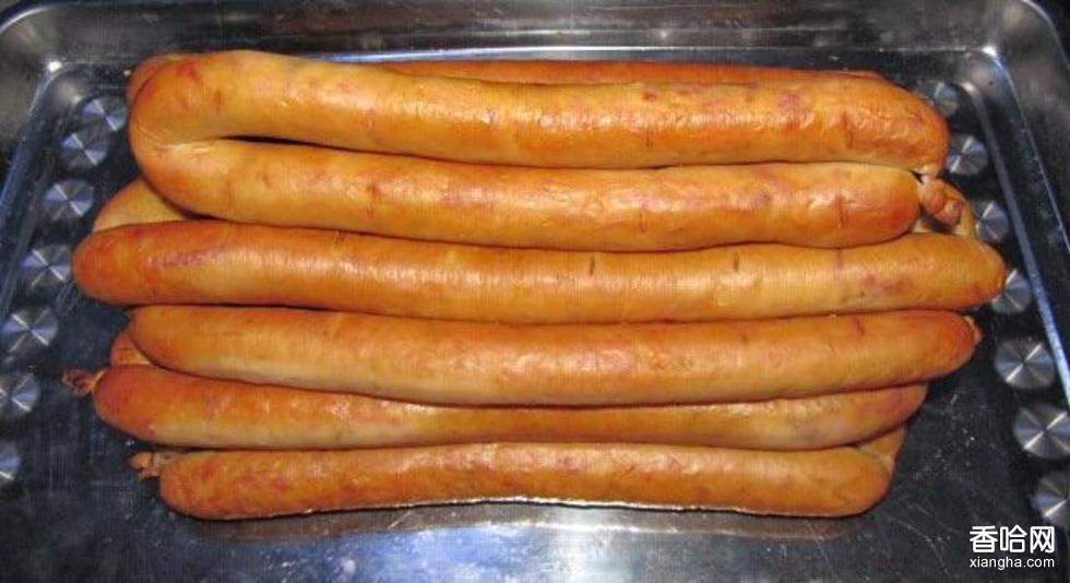 選用優(yōu)質(zhì)豬肉,并按比例添加鮮雞蛋、純綠豆粉、姜絲和小磨香油,攪拌成粥狀,灌入腸衣,用配好佐料的湯煮熟。之后,再用松樹鋸末加上白糖在熏鍋內(nèi)熏烤,松樹鋸末的作用是上色(紫紅色),白糖的作用是提鮮。最后在烤好的熏菜的外皮再抹上香油,就做好了。一般在常溫下放置三、四天也不變味。