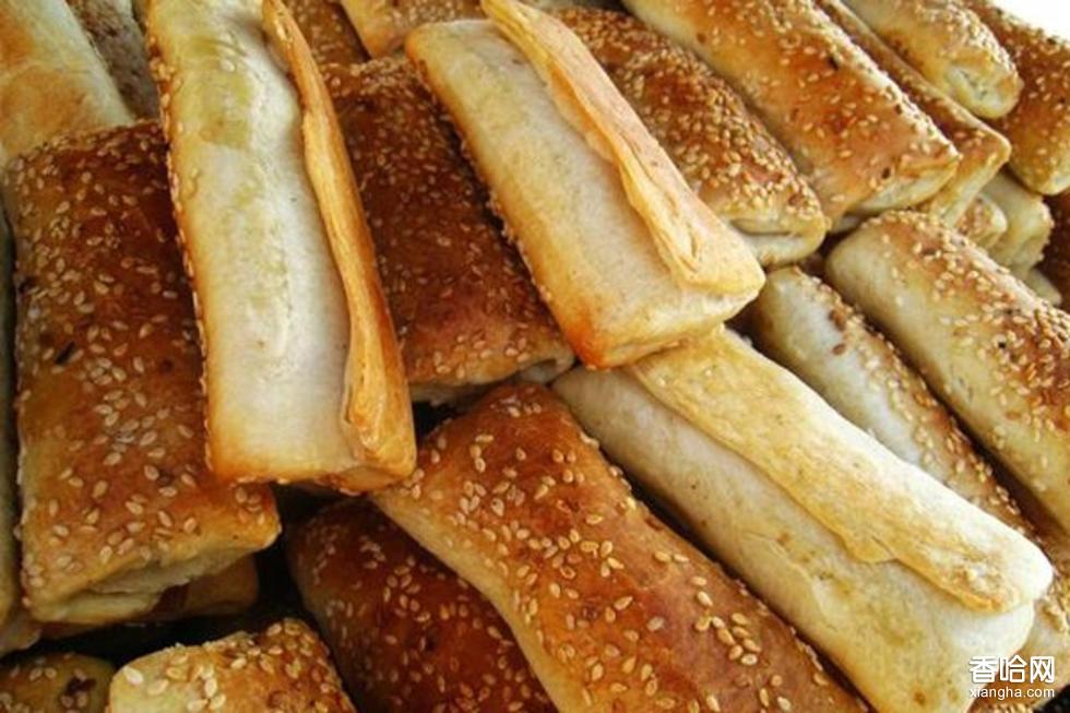 原料:白面、脫破芝麻、食油、鹽。作法:將白面放入瓷盔中,取鹽少許用涼水化開倒入面內(nèi),加水?dāng)嚢?,揉和均勻,面團(tuán)要較硬,放案板上搟成一指厚大片,倒上食用油手抹均勻,上撒白面,搓成小酥氆氌,再卷成長條,攥成拳頭粗棒條,倆人對拽扯成直徑5公分的長條,置案上手截成段,逐段搟成長片,兩頭回折,翻扣再搟長,兩頭對折成四角方形,擺齊灑水,以手在上抹成糊狀,均勻地撒上脫皮芝麻,翻扣過去,手拍背面使芝麻長牢,用一小塊面試擦生有炭火的的爐壁,看面皮呈黃色即裝爐加蓋,十分鐘左右即熟。)特點:四角方形,鼓脹焦黃,層層皮薄,酥脆清香。城府千層四方方,芝麻萬點心計長。奈何八掛爐中燒,縱到唇邊更放香。