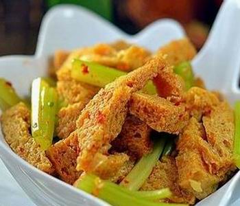 1、將所有的材料準(zhǔn)備好,水面筋用手撕成條,芹菜洗凈之后切成段?! ?