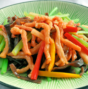 1、將豬肉洗凈,切成肉絲,加入雞精、鹽、蛋清和淀粉拌勻;白菜去葉,洗凈切絲;芹菜擇好洗凈,切成絲;將鹽、雞精、高湯和淀粉調(diào)制成芡汁備用。