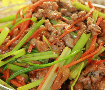 芹菜炒牛肉是最常見(jiàn)的芹菜做法。當(dāng)鮮嫩的牛肉遇上翠綠的芹菜,兩者相互融合產(chǎn)生了美妙的化學(xué)反應(yīng),炒制出一道肉嫩菜翠、味道香濃的佳肴。烹飪時(shí)一般選用鮮嫩的牛肉與芹菜加上紹酒等調(diào)料做成,是一道非常適合男女老少的家常菜。芹菜具有一股特殊的芳香,能安神鎮(zhèn)定、增強(qiáng)食欲,牛肉補(bǔ)脾胃,兩者一起食用,堪稱黃金搭檔。下面一起來(lái)學(xué)學(xué)具體的烹飪方法吧。