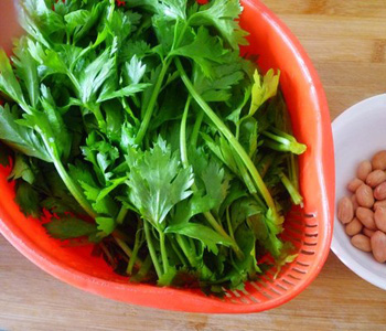 1、 芹菜葉清洗干凈,在開水中焯一下?lián)瞥?