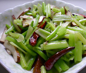材料:芹菜、海蘑菇、豬里脊、蔥、姜、干辣椒