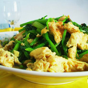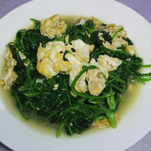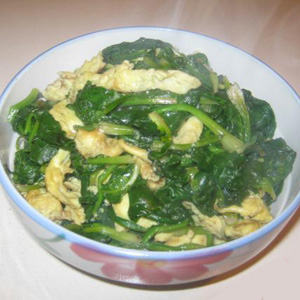 這樣,一道噴香可口,色澤明艷的菠菜炒雞蛋就做好了。