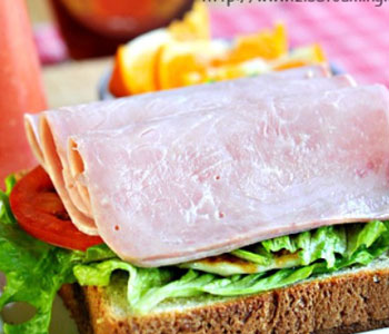 (5)再在煎蛋上面蓋一片生菜葉,上面碼放切好的西紅柿片,最后把火腿片碼在最上面,吃的時(shí)候蓋一片吐司片;