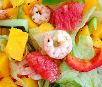 材料:生菜、芒果、蝦、甜橙、紅柚、青紅椒、黃瓜、黑胡椒、醬油、檸檬、沙拉汁