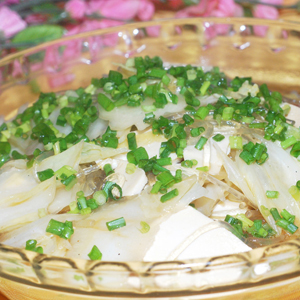 材料:豆腐,小白菜,蔥,姜,鹽