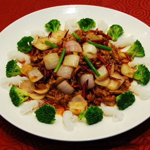 原料:洋蔥一個(gè),里脊肉250克,剁辣椒一大勺,生抽一大勺,料酒一小勺,淀粉少許,鹽一小勺。