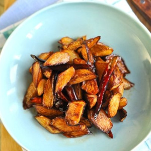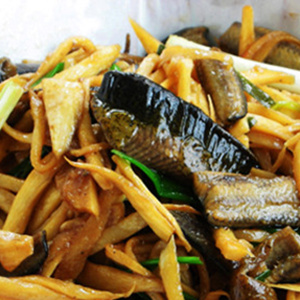 4、余油(不夠再加一些)加熱,先爆香蔥、姜、蒜、干紅椒絲,加入黃鱔絲煸炒,順鍋邊烹入白酒翻炒,然后加生抽、糖,翻炒上色調(diào)味,接著加入茭白絲煸炒,加適量水燜燒一、二分鐘。