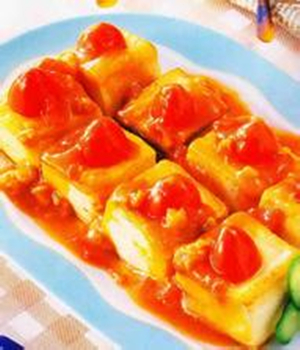 2、將小塊的西紅柿放在盤中,澆上調(diào)好的豆腐糊即可。