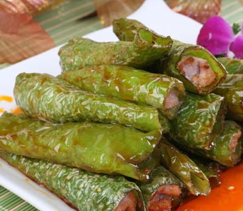 1、把尖椒的尾巴去掉,弄成尖椒成筒狀,接著把拌好的肉餡塞進(jìn)尖椒里;