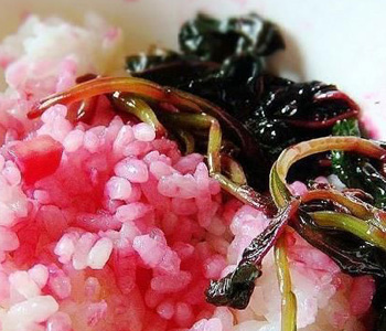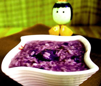 2、將粳米淘洗干凈,放入煮鍋內(nèi),加清水適量,置于火上,煮至粥成時(shí),加入豬油、紫莧菜、精鹽、味精,再煮兩三滾即成。