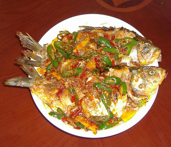 3、鍋留底油,煸香姜蒜末,加蒜蓉辣醬、洋蔥粒、青紅椒粒、料酒、蠔油、高湯、鹽、味精、胡椒粉調(diào)味,下入鯽魚,燒制3分鐘,