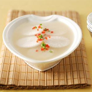 2、炒鍋炒熱放入豬油燒至五成熱時(shí),投入姜,放入魚煎至兩面略黃,加入750克開水、料酒,蘿卜絲用開水焯一下?lián)瞥龇湃脲佒?,加入蔥結(jié)用旺火燒7分鐘左右,待湯汁燒至乳白色,放入精鹽、味精,揀去蔥結(jié)、姜,撒上胡椒粉,然后先用勺子將鯽魚舀入湯碗中,再將湯和蘿卜絲倒入碗中即成。