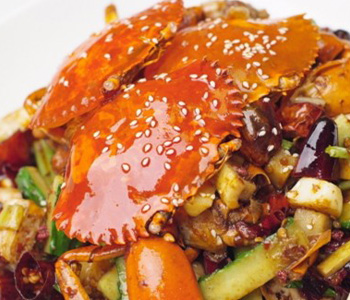 3、油鍋中投入蔥姜末炒香,倒入對(duì)成汁的調(diào)料及炸好的蟹,煎至熟,翻顛數(shù)下,澆上麻油,裝盤即可。