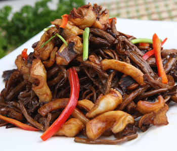 4、醬香味出來以后下入焯燙好的八爪魚翻炒幾下;