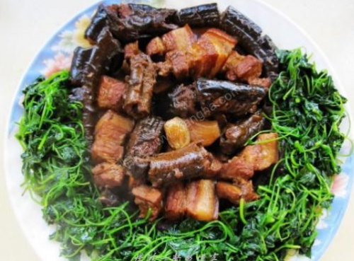 10、把鍋中的肉和黃鱔放入盆中,回周圍上金花菜。