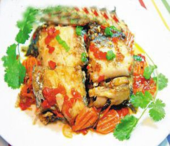 如果大家還是覺得怕上火,那不如就把帶魚做成老媽子帶魚,這道菜的基本材料:精選白帶魚、泡紅椒、番茄沙司、紅油、料酒、姜等。準備好材料之后,我們先將帶魚清洗切段,加蔥、姜、酒、鹽、味精、醋腌約15分鐘;接著把油燒五成熱,逐塊下帶魚,小火炸至金黃色撈出瀝油;等到燒熱紅油,加入番茄沙司、泡紅椒同炒至色呈鮮紅,加入少許清水燒開至香味溢出時下炸過的帶魚稍燜入味,至汁稠濃,加少許香油翻炒均勻,最后就可以出鍋了。