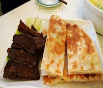 餅胚做好后,餅鐺放在微火上燒熱,先用濕布將餅鐺擦一下試一試熱度,若冒白氣就是太熱,可適當(dāng)降低火力;若一擦即干并不冒白氣,即可將餅放在餅鐺上,先在餅鐺上刷上油,再刷油于餅面,烙兩分鐘后翻過來(lái),再刷上油烙兩分鐘。以后反復(fù)地翻,若油干了隨時(shí)刷些油。前后約烙十分鐘,兩面均呈金黃色時(shí),從餅鐺上取下。放入盤中即可?!?