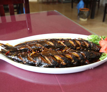 3、將煎好的青魚盛出,放入容器中,趁熱倒入少許醬油,調(diào)味,就可以食用了。