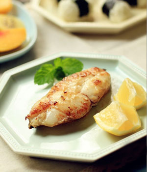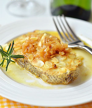 食材:鱈魚2塊,洋蔥 20g,雞蛋1個(gè),杏仁片,檸檬1小塊。