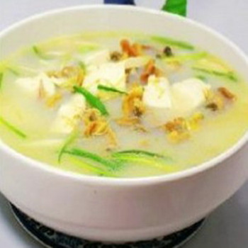 材料:河蚌數(shù)個(gè)(根據(jù)個(gè)人喜好選擇),豆腐一盒,火腿絲、姜絲、小蔥絲適量,料酒、食鹽適量。