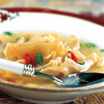 材料:鮮河蚌肉200克、黃豆10克、枸杞5克、香蔥1棵、生姜1小塊、食用油10克、香油1小匙、料酒1小匙、胡椒粉1小匙、精鹽1小匙、味精0.5小匙。