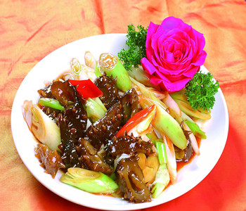4、將炒鍋置于旺火上,倒入糊蔥油(30克),燒熱后下入青蒜段和蒸好的蔥段,略煸一下,撒在海參上即成。