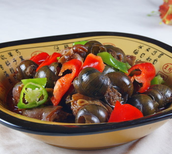 材料:田螺、味精、蒜、花椒、干辣椒、料酒、豆瓣醬、泡紅椒、植物油、白砂糖