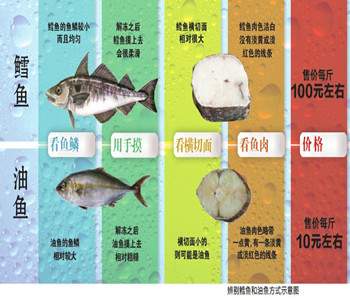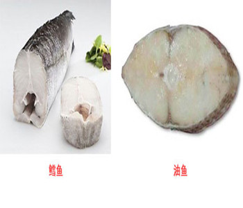 鱈魚的魚段皮發(fā)白或灰白,色淡,肉質細膩;油魚的皮為灰黑色,色深,有網(wǎng)格狀,肉質較硬且粗糙。真鱈魚的肉相比油魚更為潔白,油魚仔細看后會發(fā)現(xiàn)呈黃色。