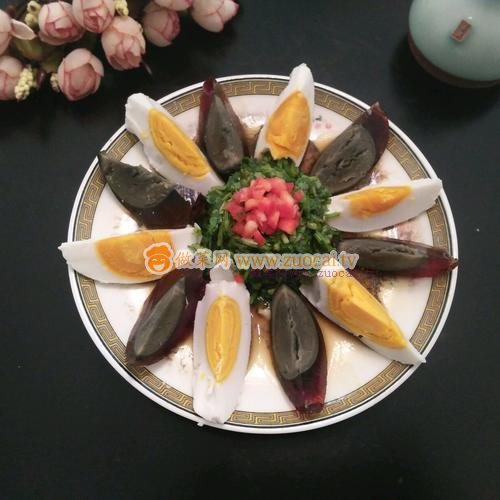 5.雙蛋擺盤,拌好的香菜放入中間,紅椒碎做裝飾