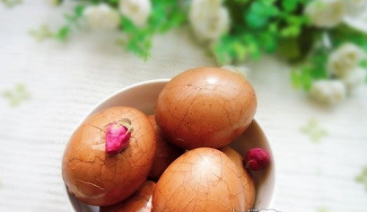 食材主料:雞蛋8個(gè)、玫瑰花10g、八角2粒、花椒適量、香葉2片、生抽老抽適量、冰糖適量