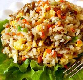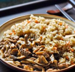 4.鍋內放油燒熱,放姜和牛肉炒散,將牛肉片入鍋炒至變色后放入些許料酒 放香菇,炒出香味后,加入少許水,然后用料酒、醬油、鹽調味。再放油燒熱,倒入米飯和胡蘿卜炒勻,放入醬油和鹽調味,咸淡適中即可