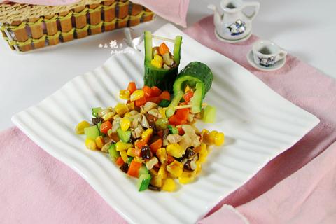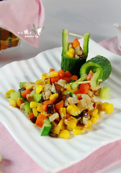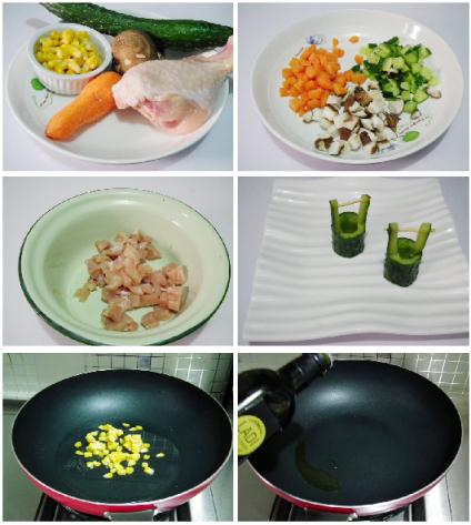 主料;雞腿肉 50克 鮮香菇 2朵 胡蘿卜 50克 玉米粒 50克 黃瓜 50克