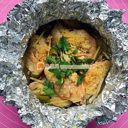 4.腌制好的雞翅撒上蒜末,用錫紙包好