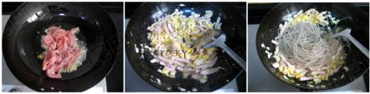 7、熱鍋下油,油燒至8成熱時,倒入剁好的姜蒜,中小火爆香,加入肉絲。