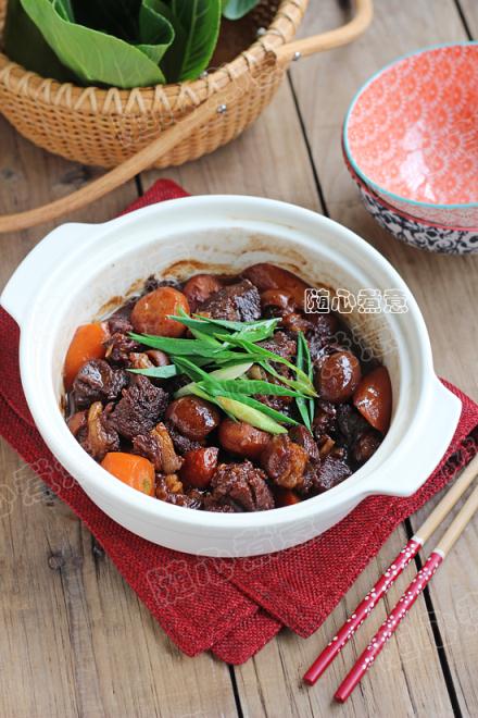 3. 鍋中倒入油燒熱,放入焯過水的羊肉翻炒微黃,放入蔥結(jié)和姜片炒香,放入馬蹄、陳皮、南乳、柱候醬、白酒翻炒均勻,移入砂煲中;