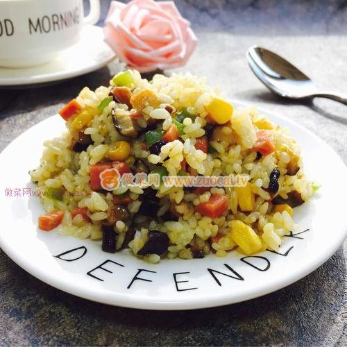 剩米飯(一份) 泡發(fā)香菇(10個) 火腿腸(兩根) 罐頭玉米(三勺) 味極鮮(少許) 鹽(少許) 菜籽油(50克)