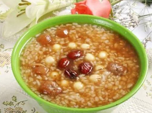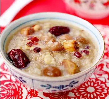 大米、糯米、玉米碴、燕麥片、粘高粱米、蕎麥米、綠豆、紅花蕓豆、核桃仁、葡萄干、青豌豆、菱角米各20克、花生30克、桂圓干15克、水發(fā)蓮子30克、栗子80克、粘玉米粒60克、鷹嘴豆30克、大棗50克、冰糖70克、水發(fā)枸杞10克。