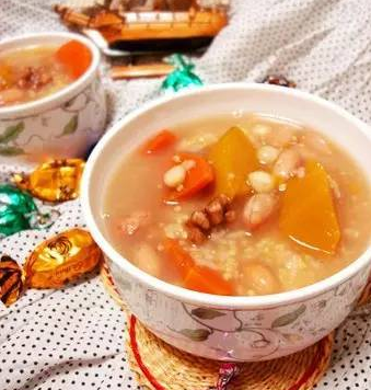 南瓜100克、大米50克、糯米50克、江豆20克、花豆20克、花生20克、阿膠棗6個(gè)、杏仁20克、枸杞10克。