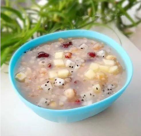 糯米、黑豆、花豆、紅豆、豌豆、黃豆、麥仁、高粱米、粟米、燕麥、玉米碎、芡實(shí)、薏苡仁、紅棗、火龍果1個(gè)、蘋果1個(gè)、白糖。