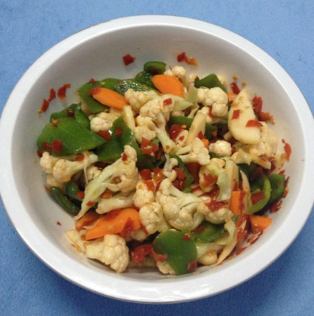 菜花500g 青椒250g 胡蘿卜250g 香油適量 鹽適量 辣椒醬1勺 醋適量 白糖適量