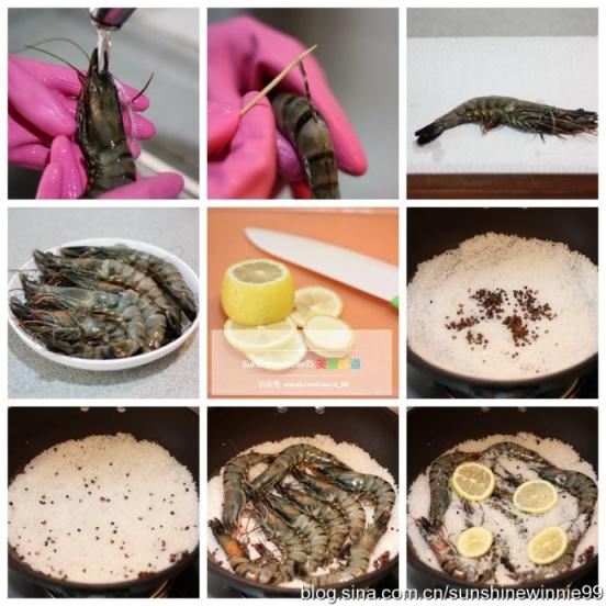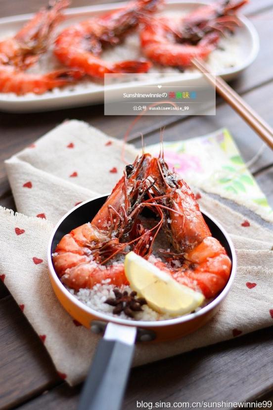 原料:越南虎蝦9只417克海鹽650克八角2個(gè) 花椒5克 檸檬半個(gè)