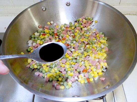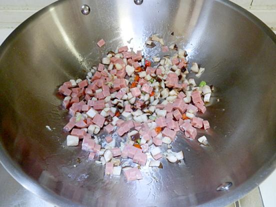 3.放入火腿丁翻炒。