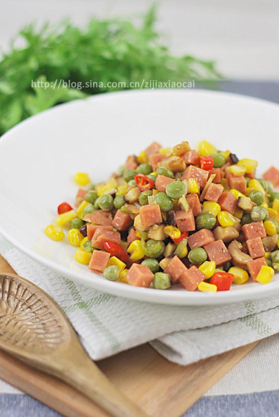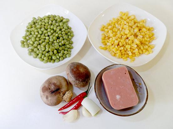 原材料:青豆200g、玉米粒200g、香菇、紅辣椒、火腿、蔥蒜。