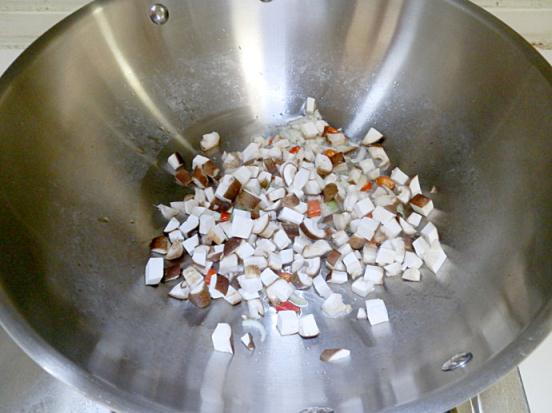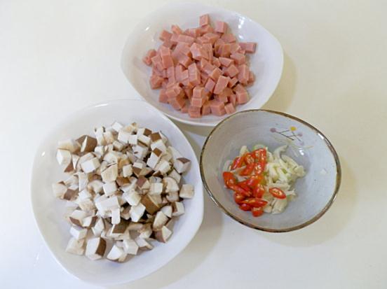 香菇去蒂切丁、火腿切丁、蔥蒜切片、紅辣椒切片。