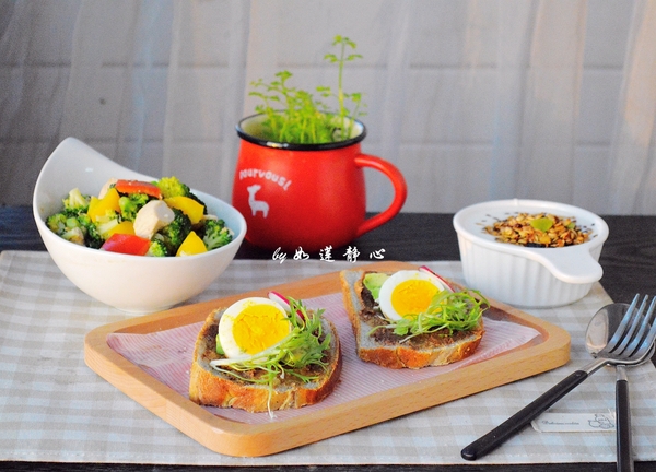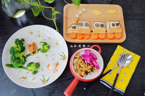 1,面包+西蘭花+鵪鶉蛋+水果堅(jiān)果麥片。小朋友起得早,一起玩美食,剝壞的鵪鶉蛋“吃掉吧”,自己畫完小火車剩下的巧克力醬“抹面包吃掉吧",等到做完說:”媽媽,我吃飽了“。