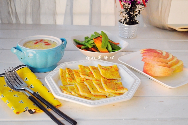 4,土豆胡蘿卜蛋餅+荷蘭豆炒胡蘿卜+酒釀蛋花圓子+蘋果。蛋餅永遠(yuǎn)是小朋友的最愛。