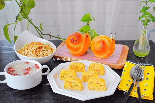 3,胡蘿卜厚蛋燒+蝸牛面包+拌厚百葉+酒釀丸子。不知從哪一天起,我們家也有了一個(gè)不愛吃胡蘿卜的小朋友,慢慢觀察下來,她對(duì)胡蘿卜并不完全排斥,比如剁碎后放在雞蛋里做成厚蛋燒,一口一個(gè)就吃得很香。